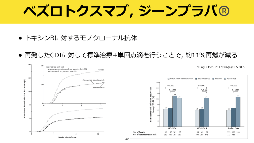 #42. ベズロトクスマブ, ジーンプラバ® • トキシンBに対するモノクローナル抗体 • 再発したCDIに対して標準治療+単回点滴を⾏うことで, 約11%再燃が減る N Engl J Med. 2017;376(4):305-317. 42