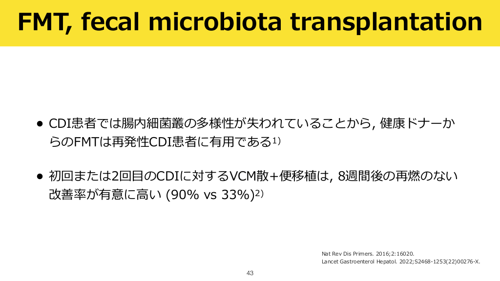 #43. FMT, fecal microbiota transplantation • CDI患者では腸内細菌叢の多様性が失われていることから, 健康ドナーか らのFMTは再発性CDI患者に有⽤である1) • 初回または2回⽬のCDIに対するVCM散+便移植は, 8週間後の再燃のない 改善率が有意に⾼い (90% vs 33%)2) Nat Rev Dis Primers. 2016;2:16020. Lancet Gastroenterol Hepatol. 2022;S2468-1253(22)00276-X. 43