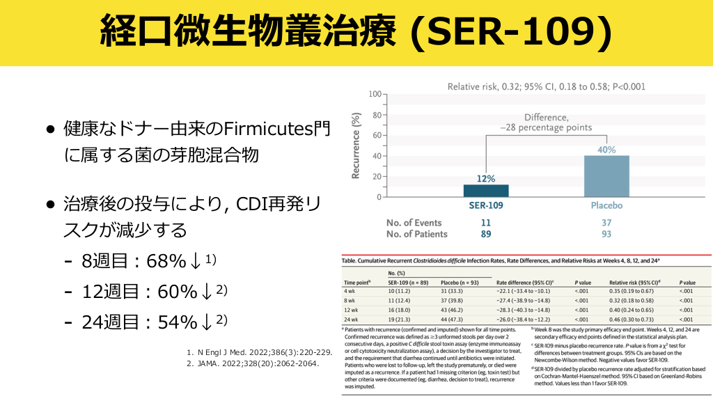 #45. 経⼝微⽣物叢治療 (SER-109) • 健康なドナー由来のFirmicutes⾨ に属する菌の芽胞混合物 • 治療後の投与により, CDI再発リ スクが減少する - 8週⽬:68%↓1) 12週⽬:60%↓2) 24週⽬:54%↓2) 1. N Engl J Med. 2022;386(3):220-229. 2. JAMA. 2022;328(20):2062-2064.