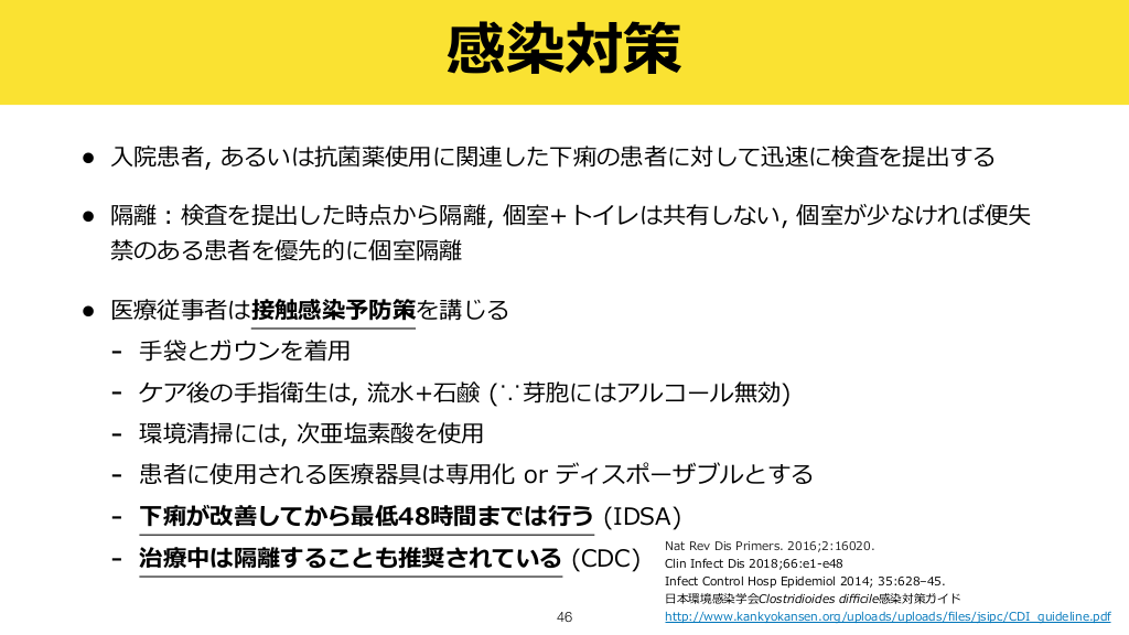 #46. 感染対策 • ⼊院患者, あるいは抗菌薬使⽤に関連した下痢の患者に対して迅速に検査を提出する • 隔離:検査を提出した時点から隔離, 個室+トイレは共有しない, 個室が少なければ便失 禁のある患者を優先的に個室隔離 • 医療従事者は接触感染予防策を講じる ⼿袋とガウンを着⽤ ケア後の⼿指衛⽣は, 流⽔+⽯鹸 (∵芽胞にはアルコール無効) 環境清掃には, 次亜塩素酸を使⽤ 患者に使⽤される医療器具は専⽤化 or ディスポーザブルとする 下痢が改善してから最低48時間までは⾏う (IDSA) 治療中は隔離することも推奨されている (CDC) fi 46 ffi - Nat Rev Dis Primers. 2016;2:16020. Clin Infect Dis 2018;66:e1-e48 Infect Control Hosp Epidemiol 2014; 35:628–45. ⽇本環境感染学会Clostridioides di cile感染対策ガイド http://www.kankyokansen.org/uploads/uploads/ les/jsipc/CDI_guideline.pdf