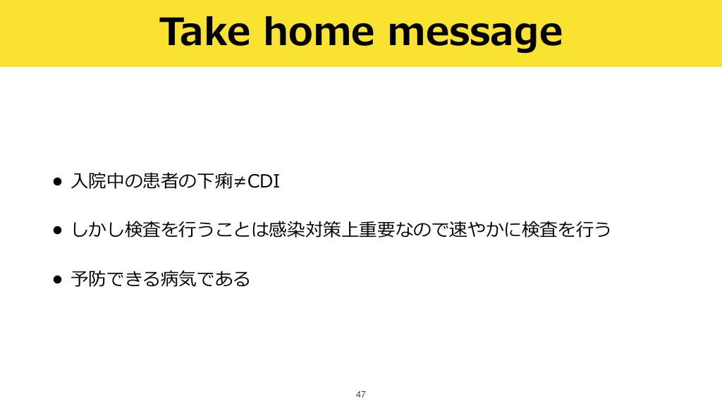 #47. Take home message • ⼊院中の患者の下痢≠CDI • しかし検査を⾏うことは感染対策上重要なので速やかに検査を⾏う • 予防できる病気である 47
