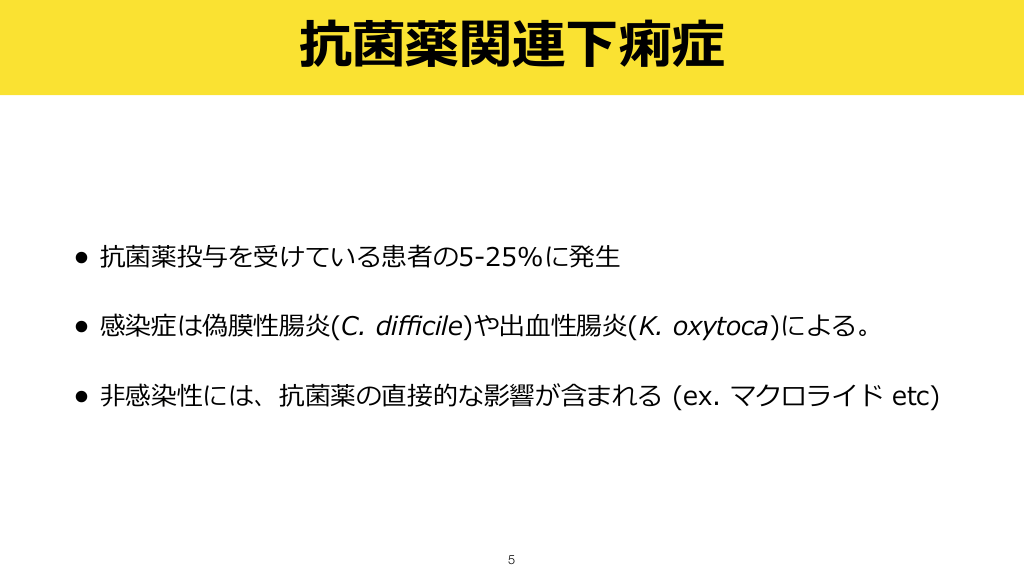 #5. 抗菌薬関連下痢症 • 抗菌薬投与を受けている患者の5-25%に発⽣ • 感染症は偽膜性腸炎(C. di cile)や出⾎性腸炎(K. oxytoca)による。 • ⾮感染性には、抗菌薬の直接的な影響が含まれる (ex. マクロライド etc) ffi 5