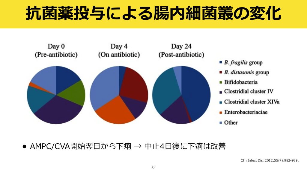 #6. 抗菌薬投与による腸内細菌叢の変化 • AMPC/CVA開始翌⽇から下痢 → 中⽌4⽇後に下痢は改善 Clin Infect Dis. 2012;55(7):982-989. 6