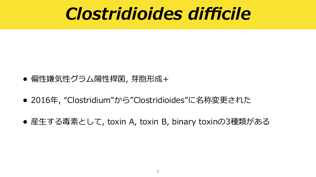 #7. Clostridioides di cile • 偏性嫌気性グラム陽性桿菌, 芽胞形成+ • 2016年, “Clostridium”から”Clostridioides”に名称変更された • 産⽣する毒素として, toxin A, toxin B, binary toxinの3種類がある ffi 7