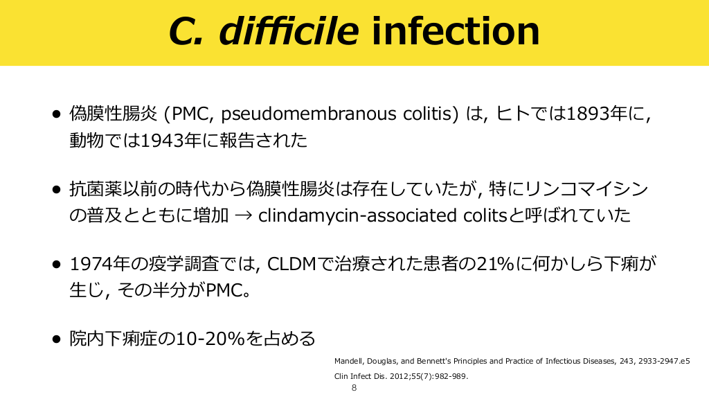 #8. C. di cile infection • 偽膜性腸炎 (PMC, pseudomembranous colitis) は, ヒトでは1893年に, 動物では1943年に報告された • 抗菌薬以前の時代から偽膜性腸炎は存在していたが, 特にリンコマイシン の普及とともに増加 → clindamycin-associated colitsと呼ばれていた • 1974年の疫学調査では, CLDMで治療された患者の21%に何かしら下痢が ⽣じ, その半分がPMC。 • 院内下痢症の10-20%を占める Mandell, Douglas, and Bennett's Principles and Practice of Infectious Diseases, 243, 2933-2947.e5 Clin Infect Dis. 2012;55(7):982-989. ffi 8
