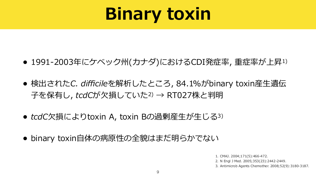 #9. Binary toxin • 1991-2003年にケベック州(カナダ)におけるCDI発症率, 重症率が上昇1) • 検出されたC. di cileを解析したところ, 84.1%がbinary toxin産⽣遺伝 ⼦を保有し, tcdCが⽋損していた2) → RT027株と判明 • tcdC⽋損によりtoxin A, toxin Bの過剰産⽣が⽣じる3) • binary toxin⾃体の病原性の全貌はまだ明らかでない 1. CMAJ. 2004;171(5):466-472. 2. N Engl J Med. 2005;353(23):2442-2449. 3. Antimicrob Agents Chemother. 2008;52(9):3180-3187. ffi 9