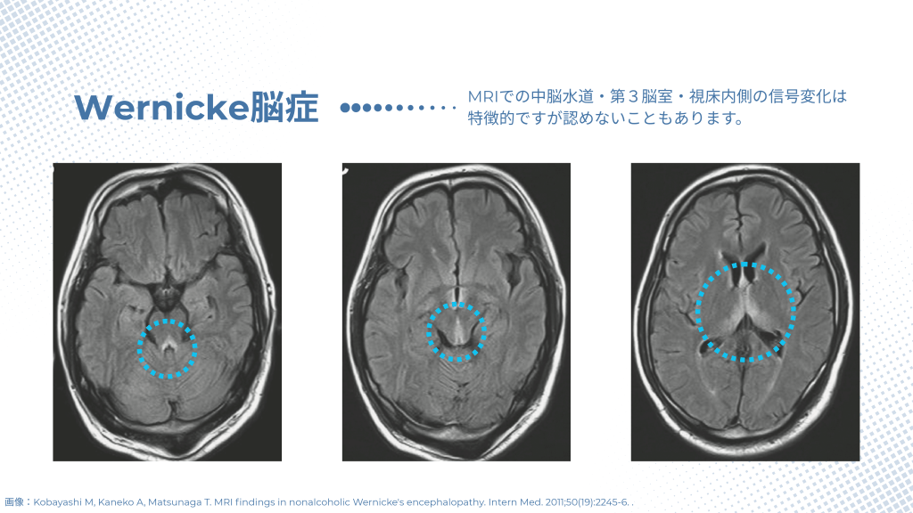 Kobayashi M, Kaneko A, Matsunaga T. MRI findings in nonalcoholic Wernicke's encephalopathy. Intern Med. 2011;50(19):2245-6.