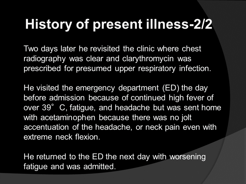 before admission because of continued high fever of over 39°C, fatigue, and headache but was sent home with acetaminophen because there was no jolt accentuation of the headache, or neck pain even with extreme neck flexion.