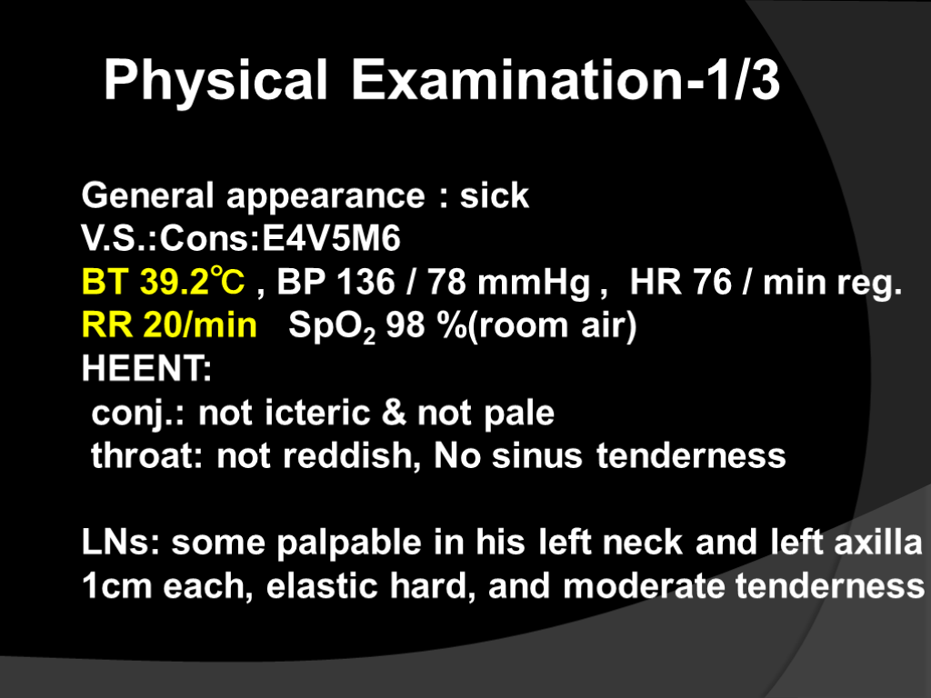 BT 39.2℃ , BP 136 / 78 mmHg , HR 76 / min reg.