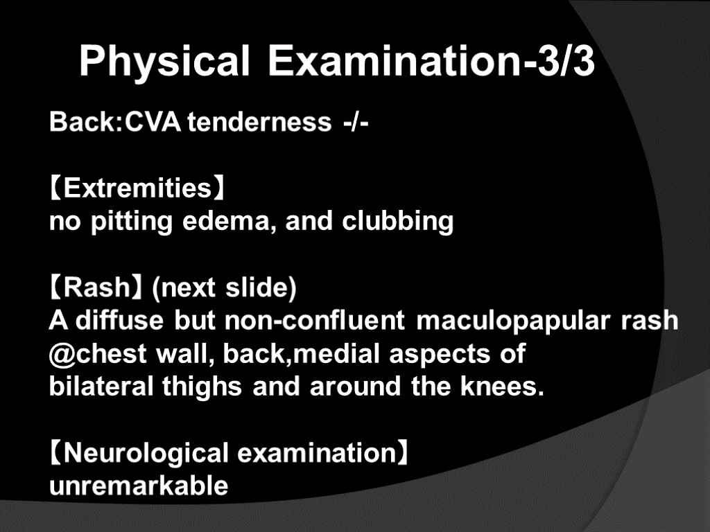 He had continued fatigue and high fever while the rash gradually fainted with oral anti-histamines and steroid ointment.