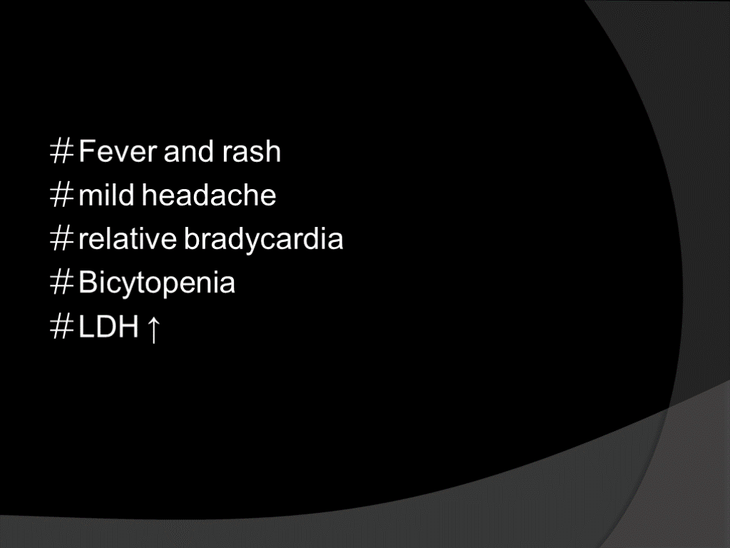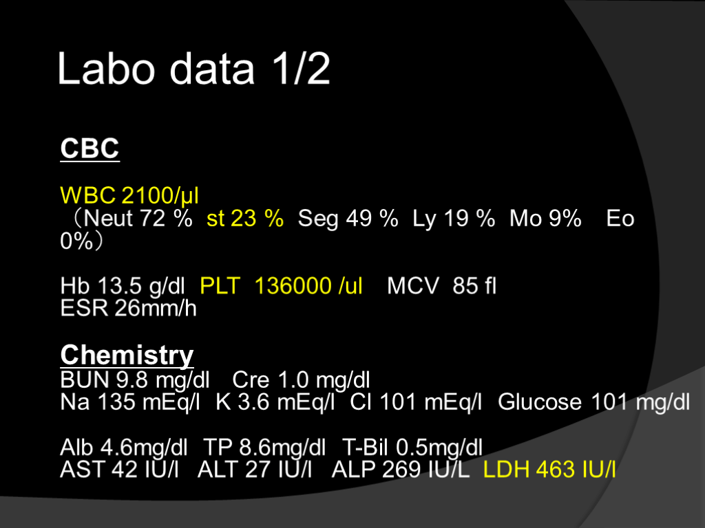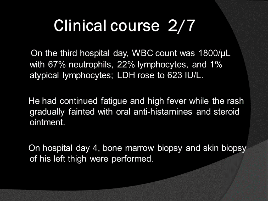 #18. Clinical course 2/7 On the third hospital day, WBC count was 1800/μL with 67% neutrophils, 22% lymphocytes, and 1% atypical lymphocytes; LDH rose to 623 IU/L.