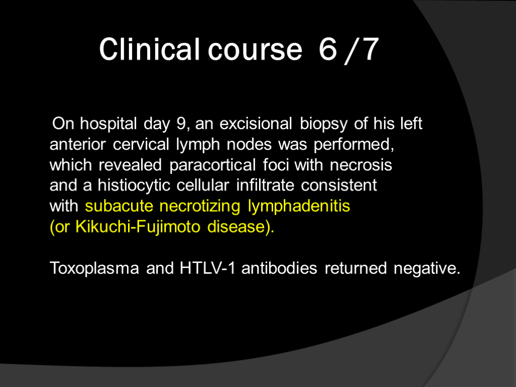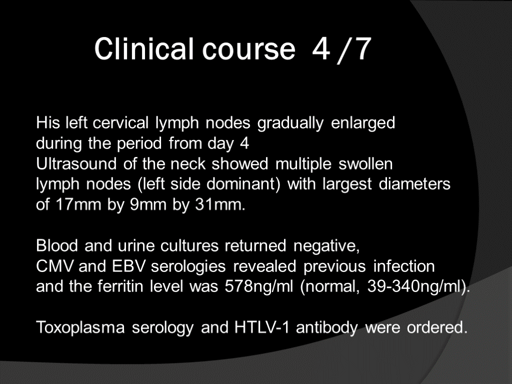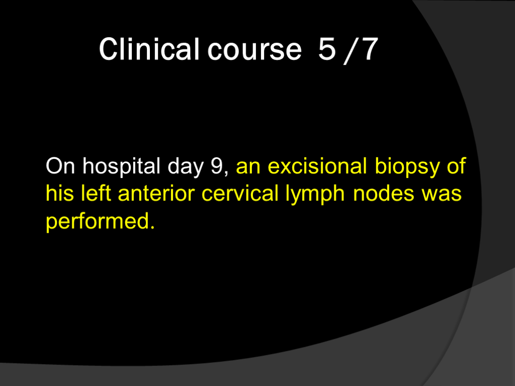 On hospital day 9, an excisional biopsy of his left anterior cervical lymph nodes was performed.