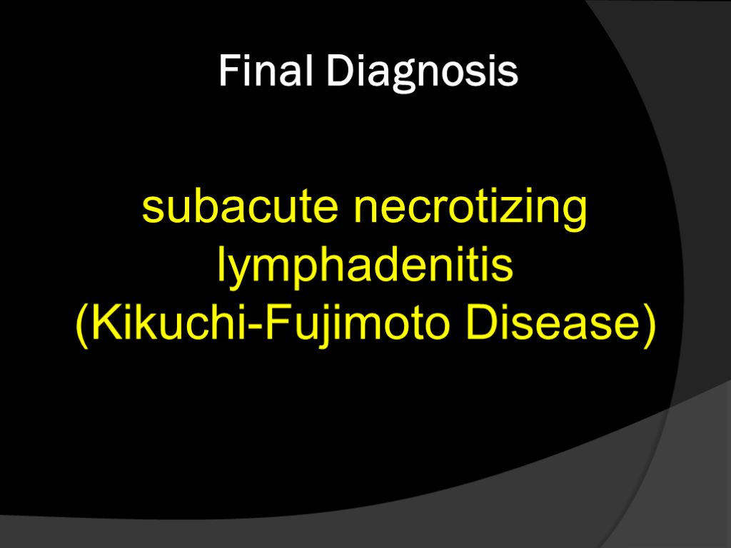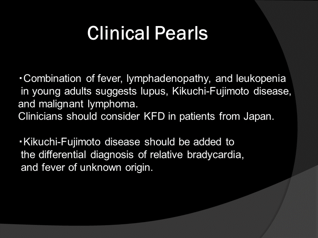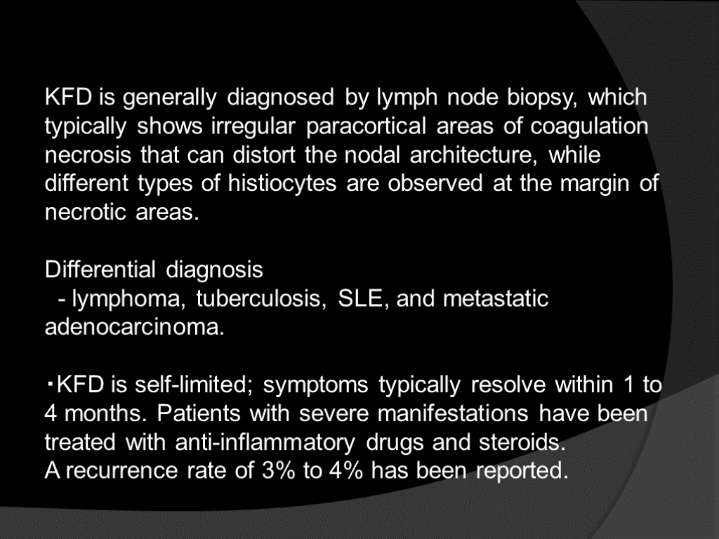 ・KFD is self-limited; symptoms typically resolve within 1 to 4 months. Patients with severe manifestations have been treated with anti-inflammatory drugs and steroids.