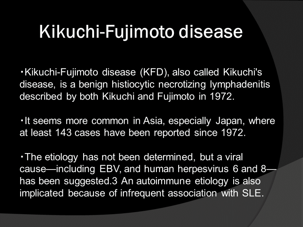 ・Kikuchi-Fujimoto disease (KFD), also called Kikuchi's disease, is a benign histiocytic necrotizing lymphadenitis described by both Kikuchi and Fujimoto in 1972.