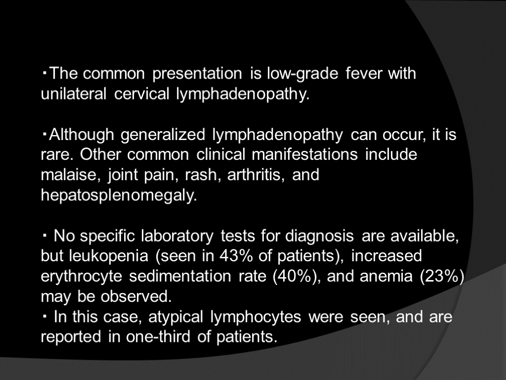 ・The common presentation is low-grade fever with unilateral cervical lymphadenopathy.