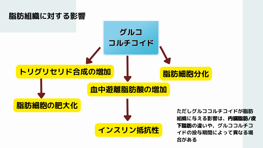 #10. 脂肪組織に対する影響 グルコ コルチコイド トリグリセリド合成の増加 脂肪細胞分化 血中遊離脂肪酸の増加 脂肪細胞の肥大化 インスリン抵抗性 ただしグルココルチコイドが脂肪 組織に与える影響は、内臓脂肪/皮 下脂肪の違いや、グルココルチコ イドの投与期間によって異なる場 合がある