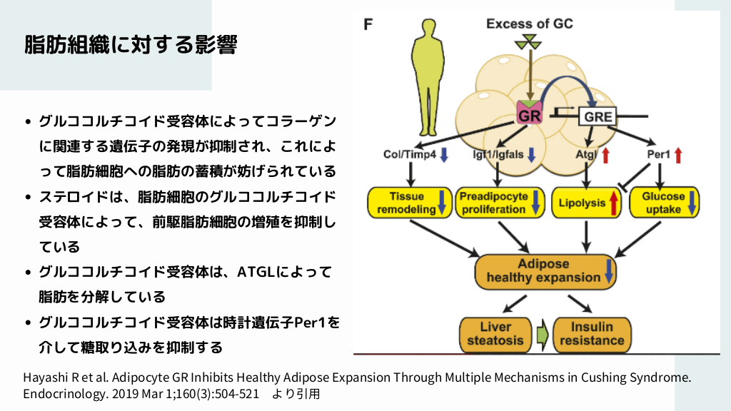 #11. 脂肪組織に対する影響 グルココルチコイド受容体によってコラーゲン に関連する遺伝子の発現が抑制され、これによ って脂肪細胞への脂肪の蓄積が妨げられている ステロイドは、脂肪細胞のグルココルチコイド 受容体によって、前駆脂肪細胞の増殖を抑制し ている グルココルチコイド受容体は、ATGLによって 脂肪を分解している グルココルチコイド受容体は時計遺伝子Per1を 介して糖取り込みを抑制する Hayashi R et al. Adipocyte GR Inhibits Healthy Adipose Expansion Through Multiple Mechanisms in Cushing Syndrome. Endocrinology. 2019 Mar 1;160(3):504-521 より引用