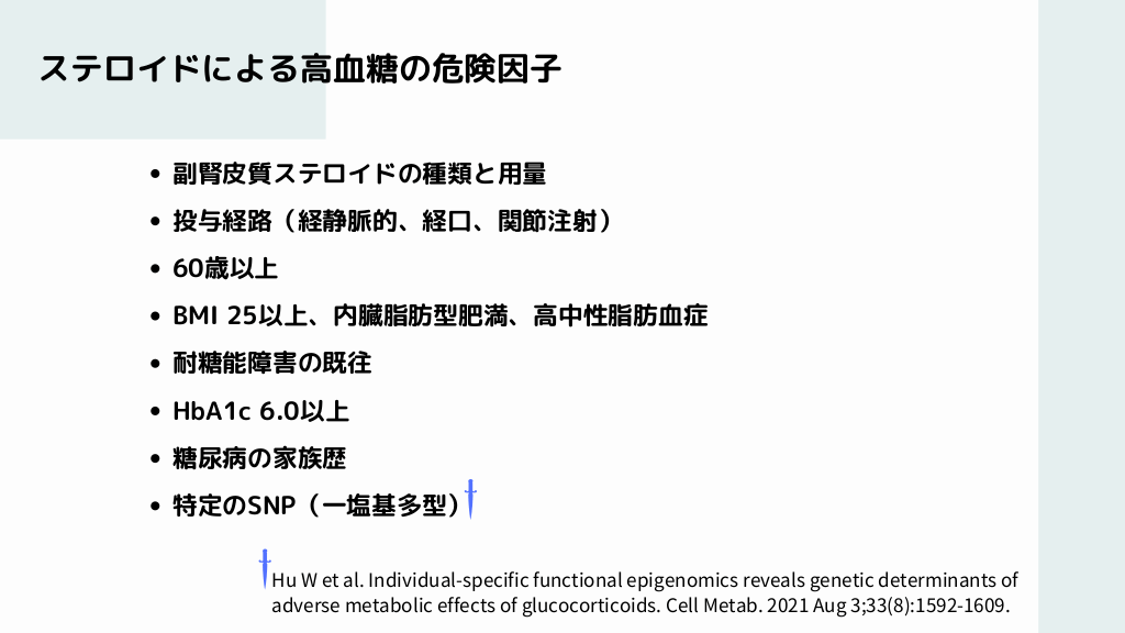 #12. ステロイドによる高血糖の危険因子 副腎皮質ステロイドの種類と用量 投与経路(経静脈的、経口、関節注射) 60歳以上 BMI 25以上、内臓脂肪型肥満、高中性脂肪血症 耐糖能障害の既往 HbA1c 6.0以上 糖尿病の家族歴 特定のSNP(一塩基多型) Hu W et al. Individual-specific functional epigenomics reveals genetic determinants of adverse metabolic effects of glucocorticoids. Cell Metab. 2021 Aug 3;33(8):1592-1609.