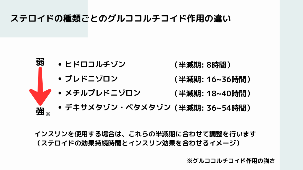 #13. ステロイドの種類ごとのグルココルチコイド作用の違い 弱 強※ ヒドロコルチゾン (半減期: 8時間) プレドニゾロン (半減期: 16~36時間) メチルプレドニゾロン (半減期: 18~40時間) デキサメタゾン・ベタメタゾン(半減期: 36~54時間) インスリンを使用する場合は、これらの半減期に合わせて調整を行います (ステロイドの効果持続時間とインスリン効果を合わせるイメージ) ※グルココルチコイド作用の強さ