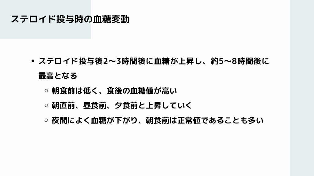 #14. ステロイド投与時の血糖変動 ステロイド投与後2〜3時間後に血糖が上昇し、約5〜8時間後に 最高となる 朝食前は低く、食後の血糖値が高い 朝直前、昼食前、夕食前と上昇していく 夜間によく血糖が下がり、朝食前は正常値であることも多い