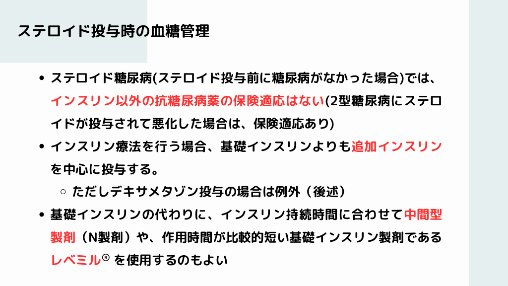 #15. ステロイド投与時の血糖管理 ステロイド糖尿病(ステロイド投与前に糖尿病がなかった場合)では、 インスリン以外の抗糖尿病薬の保険適応はない(2型糖尿病にステロ イドが投与されて悪化した場合は、保険適応あり) インスリン療法を行う場合、基礎インスリンよりも追加インスリン を中心に投与する。 ただしデキサメタゾン投与の場合は例外(後述) 基礎インスリンの代わりに、インスリン持続時間に合わせて中間型 製剤(N製剤)や、作用時間が比較的短い基礎インスリン製剤である レベミル を使用するのもよい