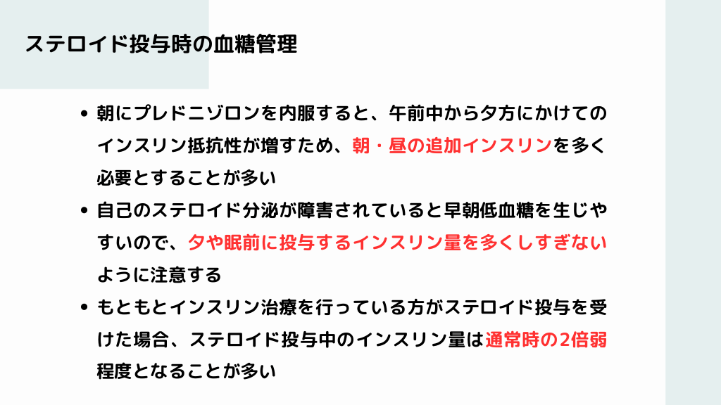 #16. ステロイド投与時の血糖管理 朝にプレドニゾロンを内服すると、午前中から夕方にかけての インスリン抵抗性が増すため、朝・昼の追加インスリンを多く 必要とすることが多い 自己のステロイド分泌が障害されていると早朝低血糖を生じや すいので、夕や眠前に投与するインスリン量を多くしすぎない ように注意する もともとインスリン治療を行っている方がステロイド投与を受 けた場合、ステロイド投与中のインスリン量は通常時の2倍弱 程度となることが多い