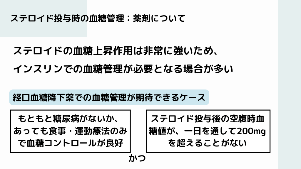 #17. ステロイド投与時の血糖管理:薬剤について ステロイドの血糖上昇作用は非常に強いため、 インスリンでの血糖管理が必要となる場合が多い 経口血糖降下薬での血糖管理が期待できるケース もともと糖尿病がないか、 あっても食事・運動療法のみ で血糖コントロールが良好 ステロイド投与後の空腹時血 糖値が、一日を通して200mg を超えることがない かつ