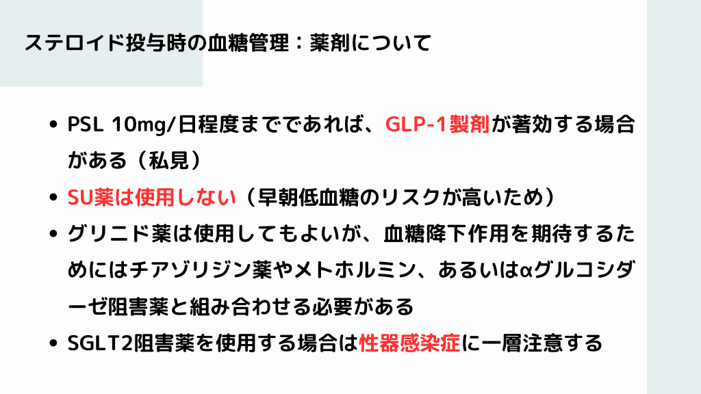 #18. ステロイド投与時の血糖管理:薬剤について PSL 10mg/日程度までであれば、GLP-1製剤が著効する場合 がある(私見) SU薬は使用しない(早朝低血糖のリスクが高いため) グリニド薬は使用してもよいが、血糖降下作用を期待するた めにはチアゾリジン薬やメトホルミン、あるいはαグルコシダ ーゼ阻害薬と組み合わせる必要がある SGLT2阻害薬を使用する場合は性器感染症に一層注意する