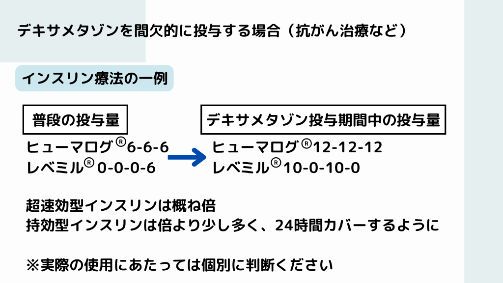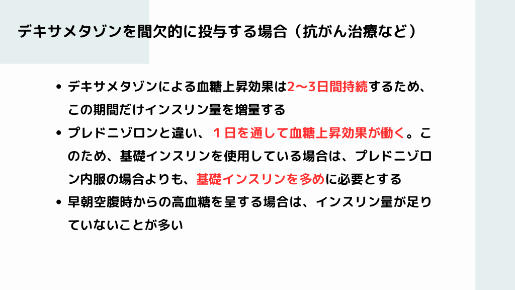#19. デキサメタゾンを間欠的に投与する場合(抗がん治療など) デキサメタゾンによる血糖上昇効果は2~3日間持続するため、 この期間だけインスリン量を増量する プレドニゾロンと違い、1日を通して血糖上昇効果が働く。こ のため、基礎インスリンを使用している場合は、プレドニゾロ ン内服の場合よりも、基礎インスリンを多めに必要とする 早朝空腹時からの高血糖を呈する場合は、インスリン量が足り ていないことが多い