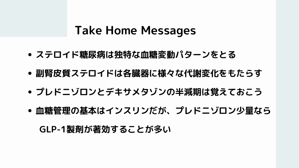 #21. Take Home Messages ステロイド糖尿病は独特な血糖変動パターンをとる 副腎皮質ステロイドは各臓器に様々な代謝変化をもたらす プレドニゾロンとデキサメタゾンの半減期は覚えておこう 血糖管理の基本はインスリンだが、プレドニゾロン少量なら GLP-1製剤が著効することが多い