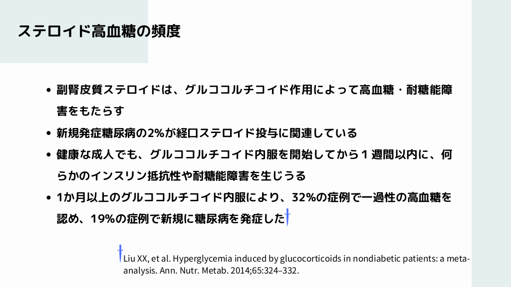 #3. ステロイド高血糖の頻度 副腎皮質ステロイドは、グルココルチコイド作用によって高血糖・耐糖能障 害をもたらす 新規発症糖尿病の2%が経口ステロイド投与に関連している 健康な成人でも、グルココルチコイド内服を開始してから1週間以内に、何 らかのインスリン抵抗性や耐糖能障害を生じうる 1か月以上のグルココルチコイド内服により、32%の症例で一過性の高血糖を 認め、19%の症例で新規に糖尿病を発症した Liu XX, et al. Hyperglycemia induced by glucocorticoids in nondiabetic patients: a metaanalysis. Ann. Nutr. Metab. 2014;65:324–332.