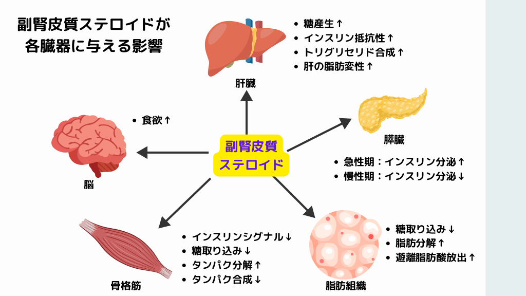 #4. 副腎皮質ステロイドが 各臓器に与える影響 糖産生↑ インスリン抵抗性↑ トリグリセリド合成↑ 肝の脂肪変性↑ 肝臓 食欲↑ 副腎皮質 ステロイド 脳 骨格筋 インスリンシグナル↓ 糖取り込み↓ タンパク分解↑ タンパク合成↓ 膵臓 急性期:インスリン分泌↑ 慢性期:インスリン分泌↓ 糖取り込み↓ 脂肪分解↑ 遊離脂肪酸放出↑ 脂肪組織