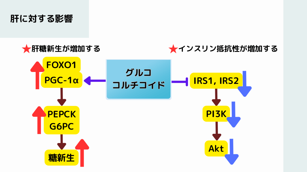 #5. 肝に対する影響 肝糖新生が増加する FOXO1 PGC-1α PEPCK G6PC 糖新生 インスリン抵抗性が増加する グルコ コルチコイド IRS1, IRS2 PI3K Akt