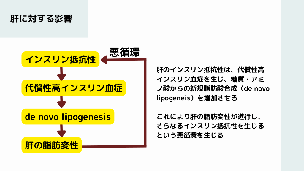 #6. 肝に対する影響 インスリン抵抗性 悪循環 代償性高インスリン血症 de novo lipogenesis 肝の脂肪変性 肝のインスリン抵抗性は、代償性高 インスリン血症を生じ、糖質・アミ ノ酸からの新規脂肪酸合成(de novo lipogeneis)を増加させる これにより肝の脂肪変性が進行し、 さらなるインスリン抵抗性を生じる という悪循環を生じる