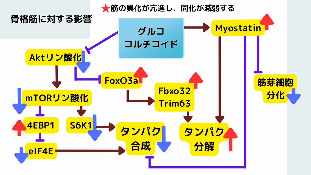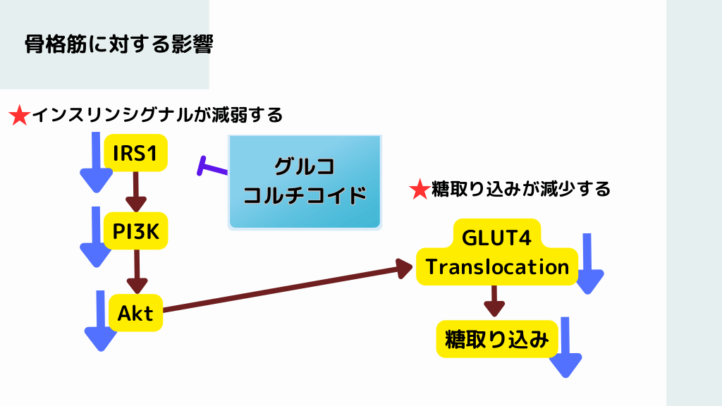 #7. 骨格筋に対する影響 インスリンシグナルが減弱する IRS1 PI3K Akt グルコ コルチコイド 糖取り込みが減少する GLUT4 Translocation 糖取り込み