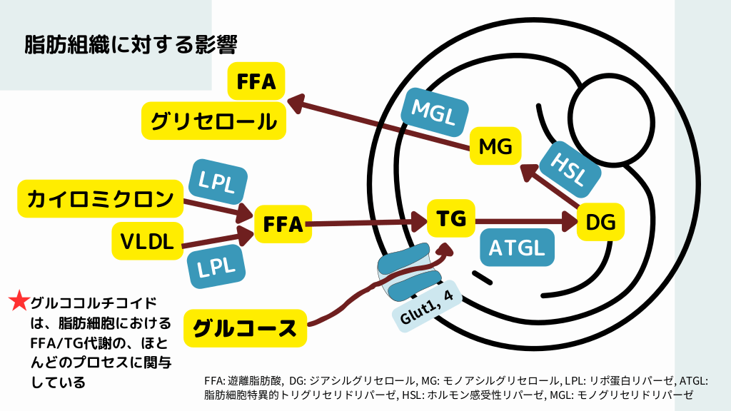 #9. 脂肪組織に対する影響 FFA グリセロール カイロミクロン VLDL グルココルチコイド は、脂肪細胞における FFA/TG代謝の、ほと んどのプロセスに関与 している MGL MG LPL FFA TG LPL グルコース ATGL HS L DG 4 , 1 t Glu FFA: 遊離脂肪酸, DG: ジアシルグリセロール, MG: モノアシルグリセロール, LPL: リポ蛋白リパーゼ, ATGL: 脂肪細胞特異的トリグリセリドリパーゼ, HSL: ホルモン感受性リパーゼ, MGL: モノグリセリドリパーゼ