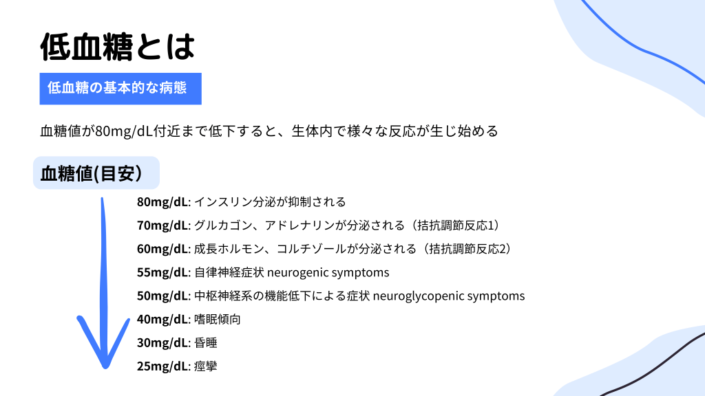 血糖値が80mg/dL付近まで低下すると、生体内で様々な反応が生じ始める