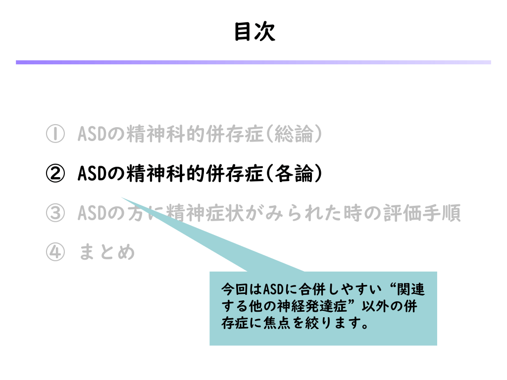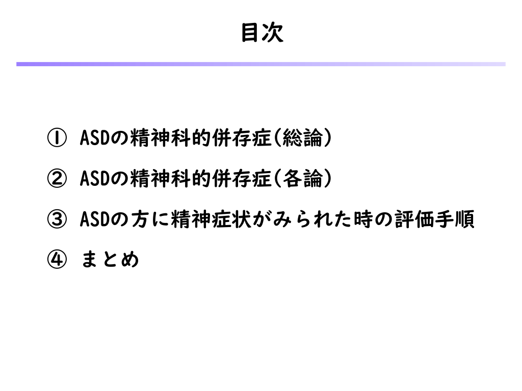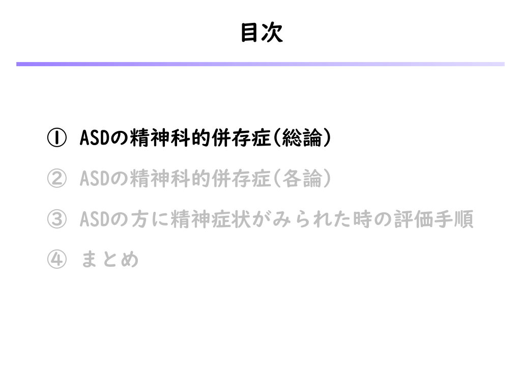 #3. 目次 ① ASDの精神科的併存症(総論) ② ASDの精神科的併存症(各論) ③ ASDの方に精神症状がみられた時の評価手順 ④ まとめ