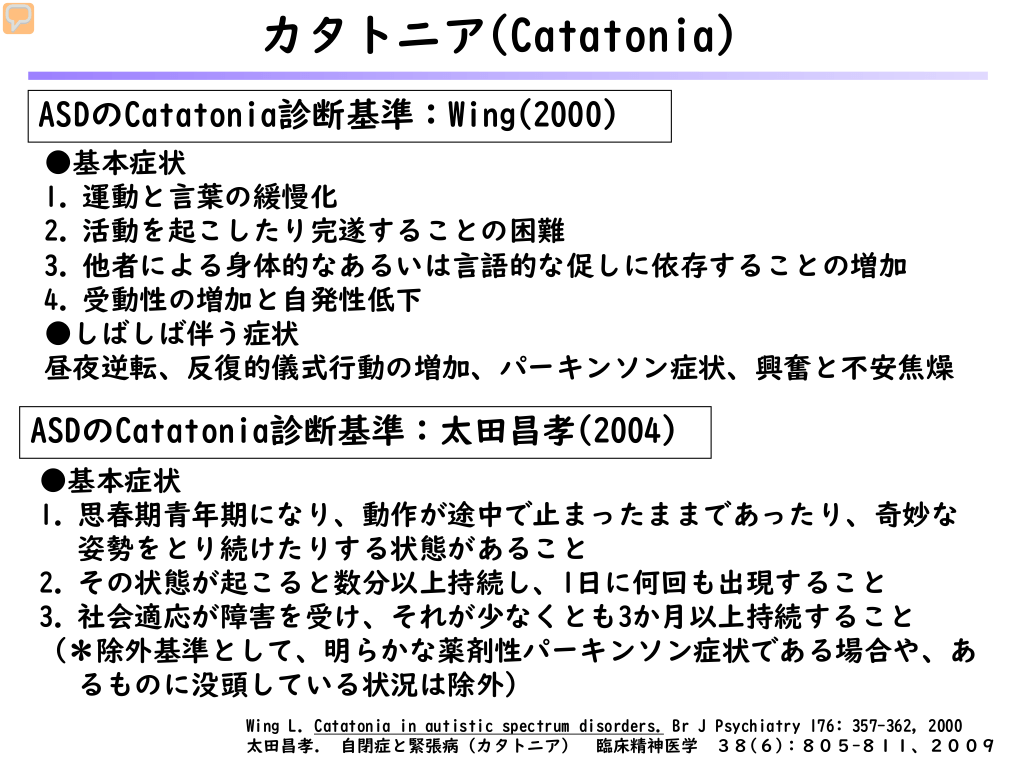 #11. カタトニア(Catatonia) ASDのCatatonia診断基準:Wing(2000) ●基本症状 1. 運動と言葉の緩慢化 2. 活動を起こしたり完遂することの困難 3. 他者による身体的なあるいは言語的な促しに依存することの増加 4. 受動性の増加と自発性低下 ●しばしば伴う症状 昼夜逆転、反復的儀式行動の増加、パーキンソン症状、興奮と不安焦燥 ASDのCatatonia診断基準:太田昌孝(2004) ●基本症状 1. 思春期青年期になり、動作が途中で止まったままであったり、奇妙な 姿勢をとり続けたりする状態があること 2. その状態が起こると数分以上持続し、1日に何回も出現すること 3. 社会適応が障害を受け、それが少なくとも3か月以上持続すること (*除外基準として、明らかな薬剤性パーキンソン症状である場合や、あ るものに没頭している状況は除外) Wing L. Catatonia in autistic spectrum disorders. Br J Psychiatry 176: 357-362, 2000 太田昌孝. 自閉症と緊張病(カタトニア) 臨床精神医学 38(6):805-811、2009