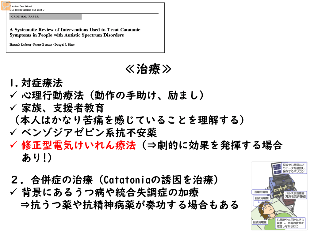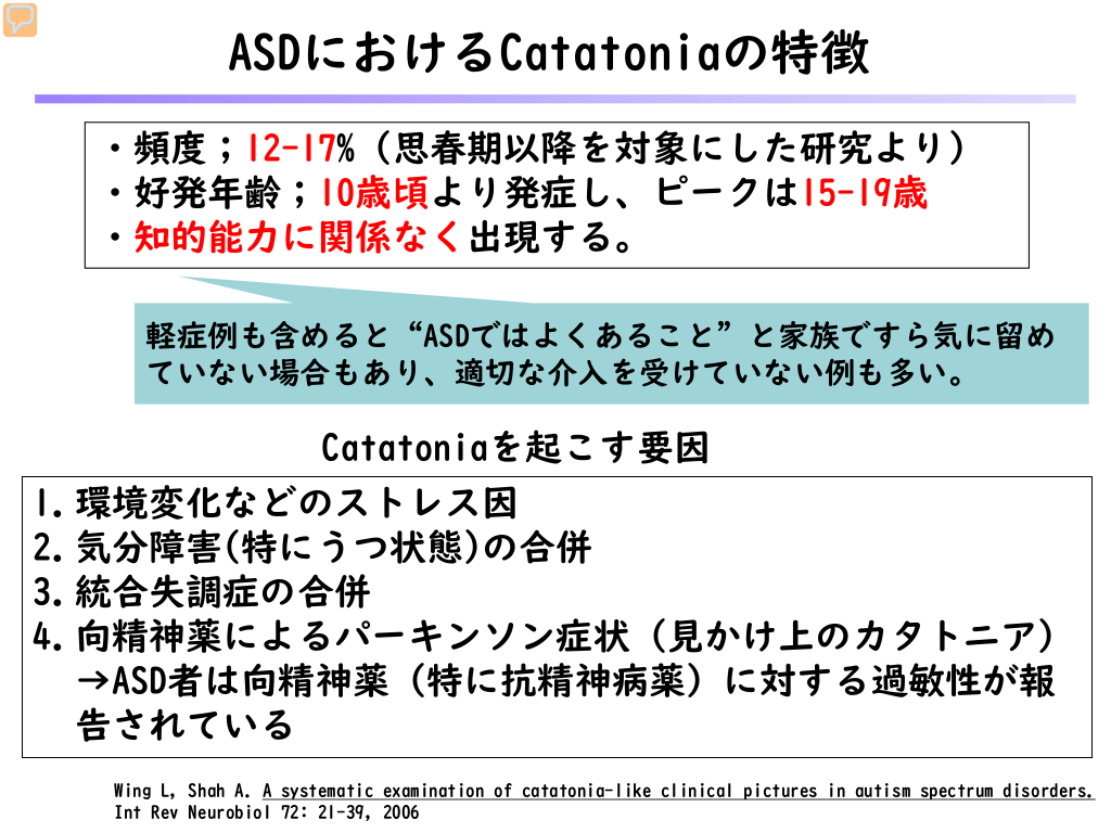 #12. ASDにおけるCatatoniaの特徴 ・頻度;12-17%(思春期以降を対象にした研究より) ・好発年齢;10歳頃より発症し、ピークは15-19歳 ・知的能力に関係なく出現する。 軽症例も含めると“ASDではよくあること”と家族ですら気に留め ていない場合もあり、適切な介入を受けていない例も多い。 Catatoniaを起こす要因 1. 環境変化などのストレス因 2. 気分障害(特にうつ状態)の合併 3. 統合失調症の合併 4. 向精神薬によるパーキンソン症状(見かけ上のカタトニア) →ASD者は向精神薬(特に抗精神病薬)に対する過敏性が報 告されている Wing L, Shah A. A systematic examination of catatonia-like clinical pictures in autism spectrum disorders. Int Rev Neurobiol 72: 21-39, 2006