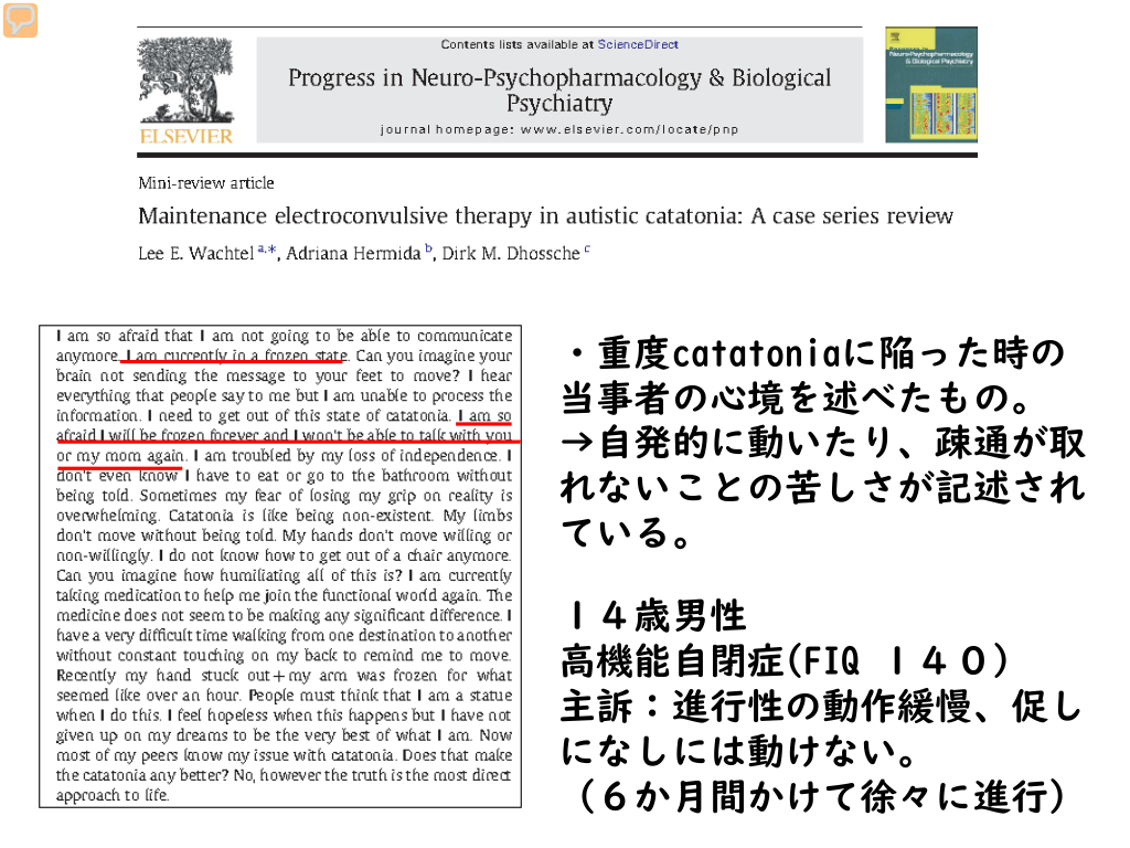 #14. ・重度catatoniaに陥った時の 当事者の心境を述べたもの。 →自発的に動いたり、疎通が取 れないことの苦しさが記述され ている。 14歳男性 高機能自閉症(FIQ 140) 主訴:進行性の動作緩慢、促し になしには動けない。 (6か月間かけて徐々に進行)