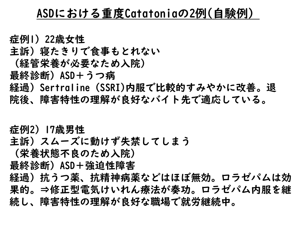 #15. ASDにおける重度Catatoniaの2例(自験例) 症例1)22歳女性 主訴)寝たきりで食事もとれない (経管栄養が必要なため入院) 最終診断)ASD+うつ病 経過)Sertraline(SSRI)内服で比較的すみやかに改善。退 院後、障害特性の理解が良好なバイト先で適応している。 症例2)17歳男性 主訴)スムーズに動けず失禁してしまう (栄養状態不良のため入院) 最終診断)ASD+強迫性障害 経過)抗うつ薬、抗精神病薬などはほぼ無効。ロラゼパムは効 果的。⇒修正型電気けいれん療法が奏功。ロラゼパム内服を継 続し、障害特性の理解が良好な職場で就労継続中。