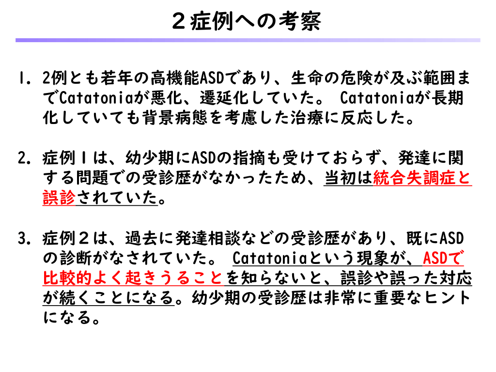 #16. 2症例への考察 1. 2例とも若年の高機能ASDであり、生命の危険が及ぶ範囲ま でCatatoniaが悪化、遷延化していた。 Catatoniaが長期 化していても背景病態を考慮した治療に反応した。 2. 症例1は、幼少期にASDの指摘も受けておらず、発達に関 する問題での受診歴がなかったため、当初は統合失調症と 誤診されていた。 3. 症例2は、過去に発達相談などの受診歴があり、既にASD の診断がなされていた。 Catatoniaという現象が、ASDで 比較的よく起きうることを知らないと、誤診や誤った対応 が続くことになる。幼少期の受診歴は非常に重要なヒント になる。