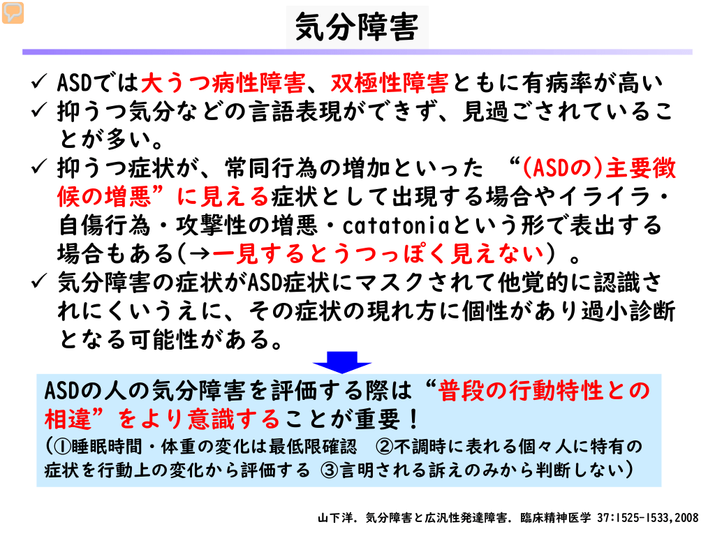 #17. 気分障害 ASDでは大うつ病性障害、双極性障害ともに有病率が高い 抑うつ気分などの言語表現ができず、見過ごされているこ とが多い。 抑うつ症状が、常同行為の増加といった “(ASDの)主要徴 候の増悪”に見える症状として出現する場合やイライラ・ 自傷行為・攻撃性の増悪・catatoniaという形で表出する 場合もある(→一見するとうつっぽく見えない)。 気分障害の症状がASD症状にマスクされて他覚的に認識さ れにくいうえに、その症状の現れ方に個性があり過小診断 となる可能性がある。 ASDの人の気分障害を評価する際は“普段の行動特性との 相違”をより意識することが重要! (①睡眠時間・体重の変化は最低限確認 ②不調時に表れる個々人に特有の 症状を行動上の変化から評価する ③言明される訴えのみから判断しない) 山下洋. 気分障害と広汎性発達障害. 臨床精神医学 37:1525-1533,2008