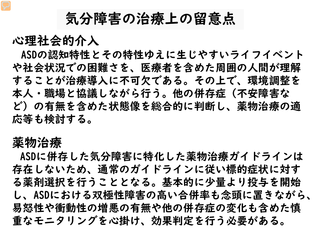 #18. 気分障害の治療上の留意点 心理社会的介入 ASDの認知特性とその特性ゆえに生じやすいライフイベント や社会状況での困難さを、医療者を含めた周囲の人間が理解 することが治療導入に不可欠である。その上で、環境調整を 本人・職場と協議しながら行う。他の併存症(不安障害な ど)の有無を含めた状態像を総合的に判断し、薬物治療の適 応等も検討する。 薬物治療 ASDに併存した気分障害に特化した薬物治療ガイドラインは 存在しないため、通常のガイドラインに従い標的症状に対す る薬剤選択を行うこととなる。基本的に少量より投与を開始 し、ASDにおける双極性障害の高い合併率も念頭に置きながら、 易怒性や衝動性の増悪の有無や他の併存症の変化も含めた慎 重なモニタリングを心掛け、効果判定を行う必要がある。