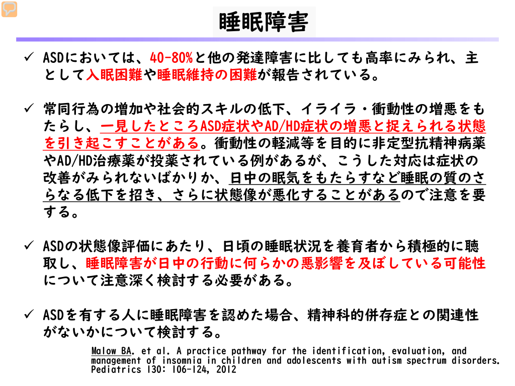 #19. 睡眠障害 ASDにおいては、40-80%と他の発達障害に比しても高率にみられ、主 として入眠困難や睡眠維持の困難が報告されている。 常同行為の増加や社会的スキルの低下、イライラ・衝動性の増悪をも たらし、一見したところASD症状やAD/HD症状の増悪と捉えられる状態 を引き起こすことがある。衝動性の軽減等を目的に非定型抗精神病薬 やAD/HD治療薬が投薬されている例があるが、こうした対応は症状の 改善がみられないばかりか、日中の眠気をもたらすなど睡眠の質のさ らなる低下を招き、さらに状態像が悪化することがあるので注意を要 する。 ASDの状態像評価にあたり、日頃の睡眠状況を養育者から積極的に聴 取し、睡眠障害が日中の行動に何らかの悪影響を及ぼしている可能性 について注意深く検討する必要がある。 ASDを有する人に睡眠障害を認めた場合、精神科的併存症との関連性 がないかについて検討する。 Malow BA. et al. A practice pathway for the identification, evaluation, and management of insomnia in children and adolescents with autism spectrum disorders. Pediatrics 130: 106-124, 2012