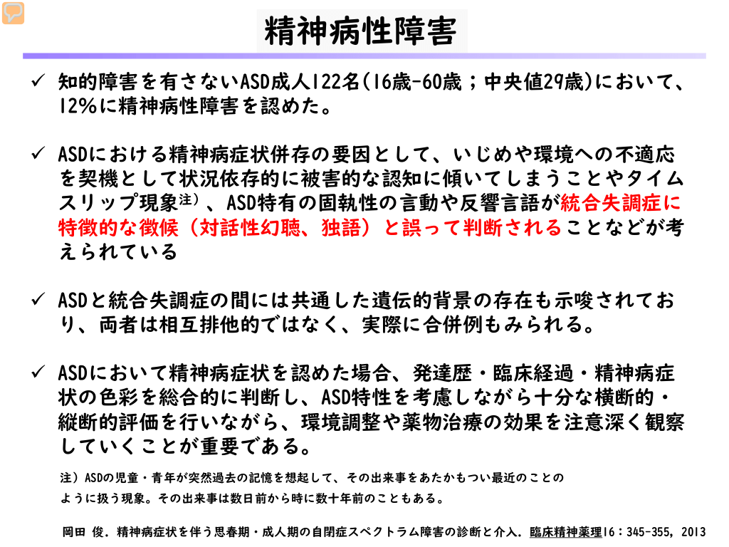 #20. 精神病性障害 知的障害を有さないASD成人122名(16歳-60歳;中央値29歳)において、 12%に精神病性障害を認めた。 ASDにおける精神病症状併存の要因として、いじめや環境への不適応 を契機として状況依存的に被害的な認知に傾いてしまうことやタイム スリップ現象注)、ASD特有の固執性の言動や反響言語が統合失調症に 特徴的な徴候(対話性幻聴、独語)と誤って判断されることなどが考 えられている ASDと統合失調症の間には共通した遺伝的背景の存在も示唆されてお り、両者は相互排他的ではなく、実際に合併例もみられる。 ASDにおいて精神病症状を認めた場合、発達歴・臨床経過・精神病症 状の色彩を総合的に判断し、ASD特性を考慮しながら十分な横断的・ 縦断的評価を行いながら、環境調整や薬物治療の効果を注意深く観察 していくことが重要である。 注)ASDの児童・青年が突然過去の記憶を想起して、その出来事をあたかもつい最近のことの ように扱う現象。その出来事は数日前から時に数十年前のこともある。 岡田 俊. 精神病症状を伴う思春期・成人期の自閉症スペクトラム障害の診断と介入. 臨床精神薬理16:345-355, 2013