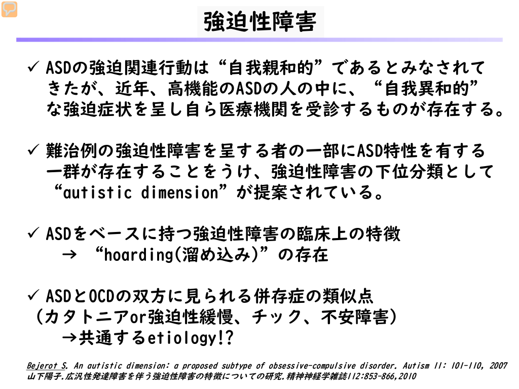 #21. 強迫性障害 ASDの強迫関連行動は“自我親和的”であるとみなされて きたが、近年、高機能のASDの人の中に、“自我異和的” な強迫症状を呈し自ら医療機関を受診するものが存在する。 難治例の強迫性障害を呈する者の一部にASD特性を有する 一群が存在することをうけ、強迫性障害の下位分類として “autistic dimension”が提案されている。 ASDをベースに持つ強迫性障害の臨床上の特徴 → “hoarding(溜め込み)”の存在 ASDとOCDの双方に見られる併存症の類似点 (カタトニアor強迫性緩慢、チック、不安障害) →共通するetiology!? Bejerot S. An autistic dimension: a proposed subtype of obsessive-compulsive disorder. Autism 11: 101-110, 2007 山下陽子.広汎性発達障害を伴う強迫性障害の特徴についての研究.精神神経学雑誌112:853-866,2010