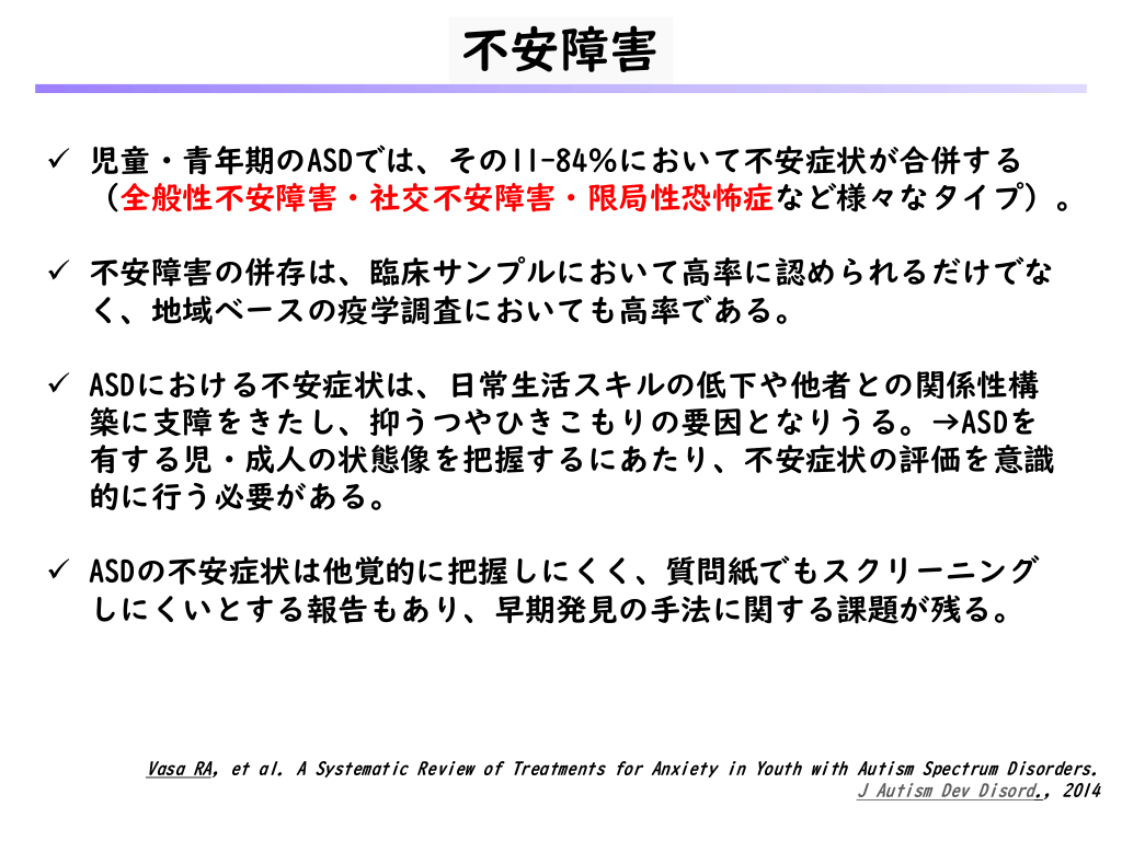 #22. 不安障害 児童・青年期のASDでは、その11-84%において不安症状が合併する (全般性不安障害・社交不安障害・限局性恐怖症など様々なタイプ)。 不安障害の併存は、臨床サンプルにおいて高率に認められるだけでな く、地域ベースの疫学調査においても高率である。 ASDにおける不安症状は、日常生活スキルの低下や他者との関係性構 築に支障をきたし、抑うつやひきこもりの要因となりうる。→ASDを 有する児・成人の状態像を把握するにあたり、不安症状の評価を意識 的に行う必要がある。 ASDの不安症状は他覚的に把握しにくく、質問紙でもスクリーニング しにくいとする報告もあり、早期発見の手法に関する課題が残る。 Vasa RA, et al. A Systematic Review of Treatments for Anxiety in Youth with Autism Spectrum Disorders. J Autism Dev Disord., 2014