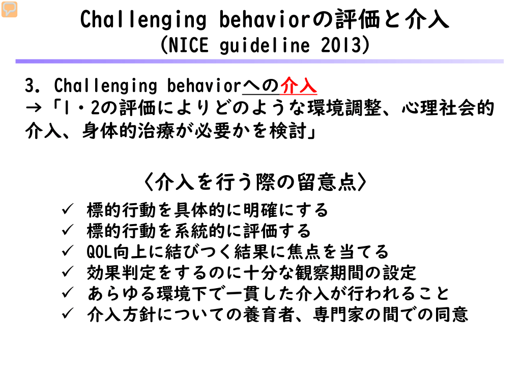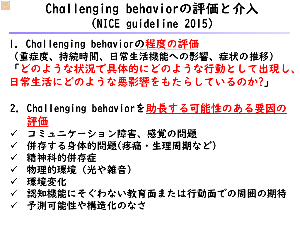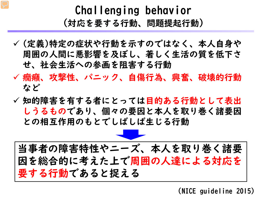 #23. Challenging behavior (対応を要する行動、問題提起行動) (定義)特定の症状や行動を示すのではなく、本人自身や 周囲の人間に悪影響を及ぼし、著しく生活の質を低下さ せ、社会生活への参画を阻害する行動 癇癪、攻撃性、パニック、自傷行為、興奮、破壊的行動 など 知的障害を有する者にとっては目的ある行動として表出 しうるものであり、個々の要因と本人を取り巻く諸要因 との相互作用のもとでしばしば生じる行動 当事者の障害特性やニーズ、本人を取り巻く諸要 因を総合的に考えた上で周囲の人達による対応を 要する行動であると捉える (NICE guideline 2015)